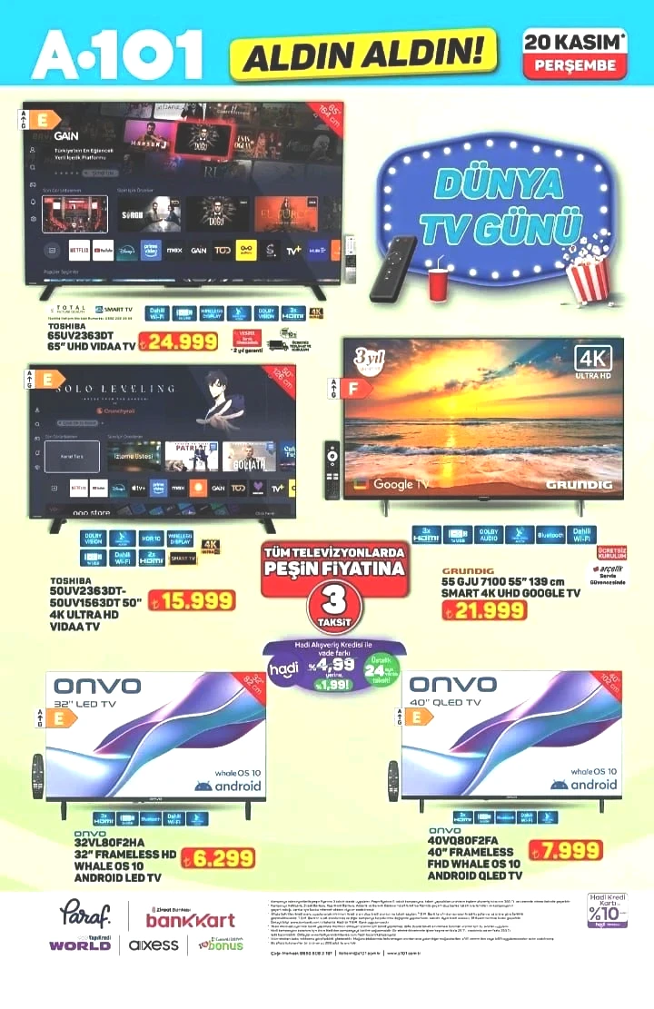 20 Kasım kataloğunda teknoloji ürünleri de geniş yer buluyor. Toshiba 65” UHD VIDAA TV ve Toshiba 50” 4K Ultra HD modelleri, evini yenilemek isteyenlere uygun fiyatlı seçenekler sunuyor. Ayrıca kulaklık, hoparlör ve aksiyon kamerası gibi dijital ürünler de bu haftanın dikkat çekici alternatifleri arasında yer alıyor.