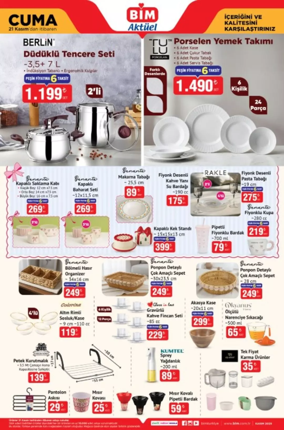 Bu hafta mutfak bölümünde öne çıkan ürünlerin başında Berlin düdüklü tencere seti, Tulu porselen yemek takımı, Benante saklama kabı setleri, baharatlık çeşitleri, fiyonklu kupa, narenciye sıkacağı, pasta tabakları, bardak setleri ve çok amaçlı organizer ürünleri bulunuyor. Ev düzenini kolaylaştıran organizer çeşitleri ile birlikte günlük kullanılan mutfak ürünlerinde de ekonomik fiyatlar sunuluyor.