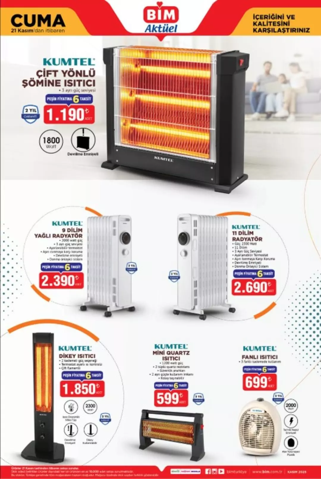 21 Kasım kataloğunun en çok ilgi gören bölümlerinden biri Kumtel ısıtıcı çeşitleri oluyor. Evini ekonomik şekilde ısıtmak isteyenler için farklı modellerde avantajlı fiyatlar dikkat çekiyor. Kumtel çift yönlü şömine ısıtıcı, Kumtel yağlı radyatörler, dikey ısıtıcı modelleri, mini quartz ısıtıcı ve fanlı ısıtıcı seçenekleri, uygun fiyatlarla müşterilere sunulacak. Kış aylarının başlamasıyla ısıtıcı ürünlerine ilginin arttığı bu dönemde katalogdaki fiyatlar yoğun talep görecek gibi görünüyor.