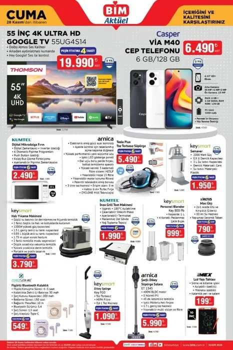Bu hafta BİM, hem market alışverişinde avantaj sağlayan ürünler hem de ev için gerekli teknolojik cihazları aynı dönemde müşterilerine sunarak geniş bir kitleye hitap ediyor. 25 Kasım kataloğunda ev ekonomisine destek olacak gıda ve temizlik ürünleri ön plana çıkarken, 28 Kasım kataloğu daha çok uzun ömürlü ürün yatırımı yapmak isteyenleri hedefliyor.